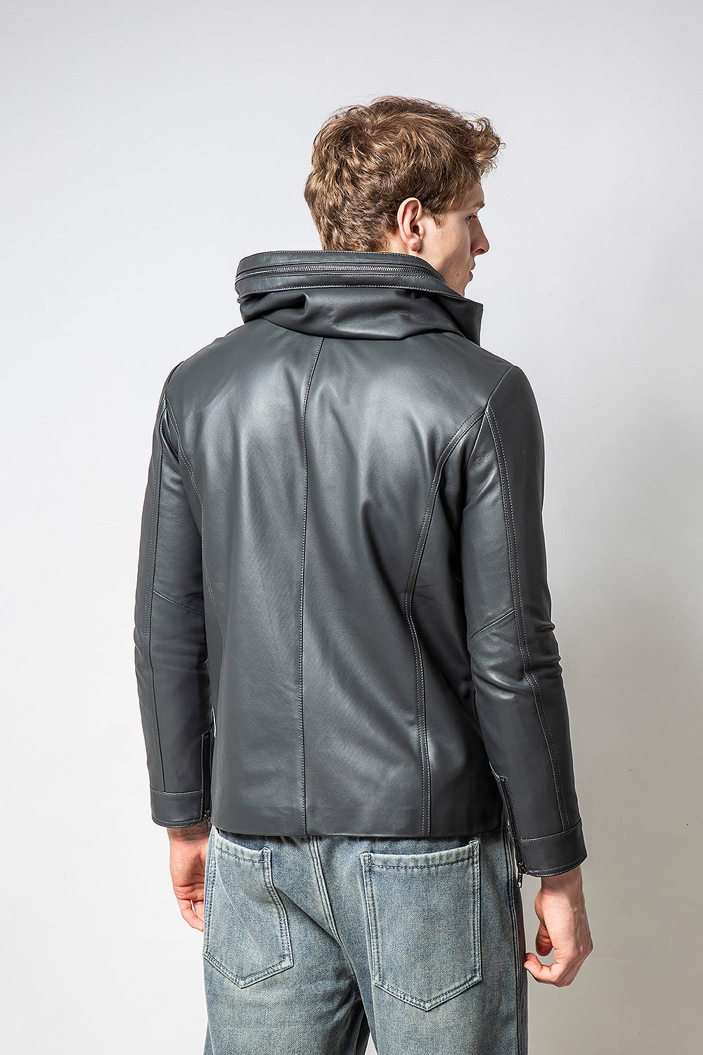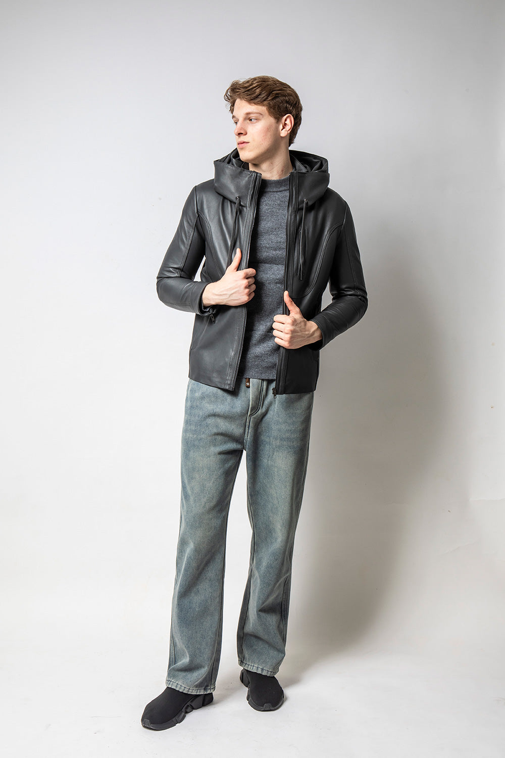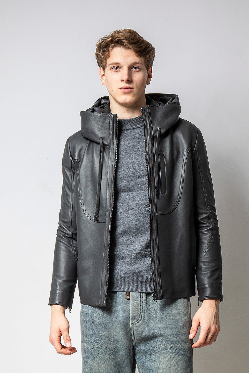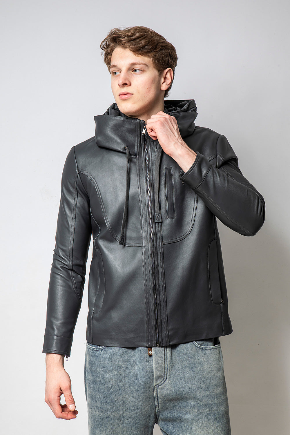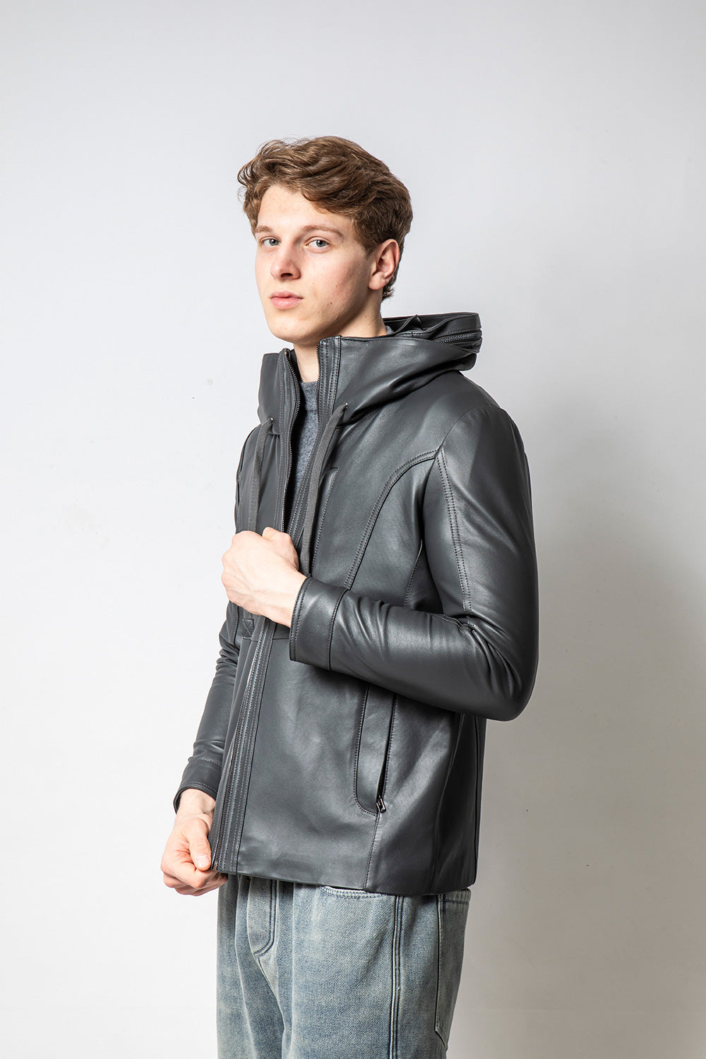 HOODIE深灰裝飾帽款皮外套